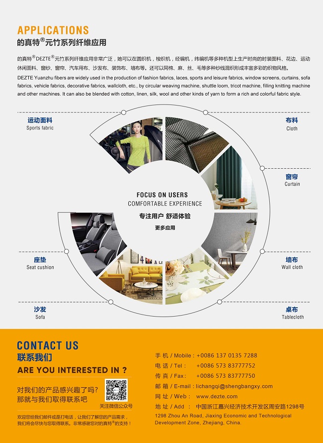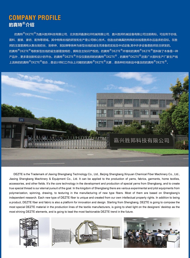無論圓機、橫機、各種梭織機、經編機均可適用,節部分精確可控,批號恒定,100%重現,而且可以按客戶、設計師要求精確確定節的大小、排列方式、吸色程度。“的真特”滌綸竹節絲“節”部分的剛性、柔性及結晶度可精確控制,且單絲至0.3d的長絲勝邦都可以做出竹節。